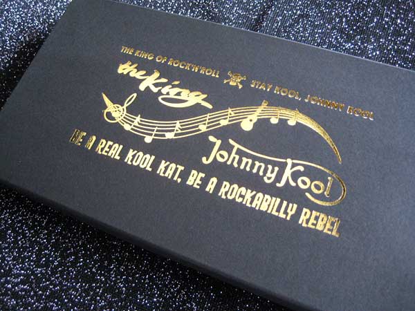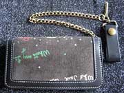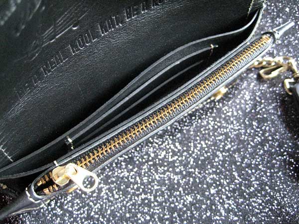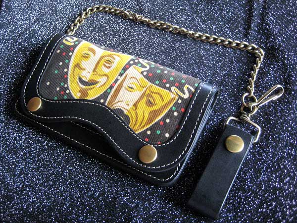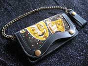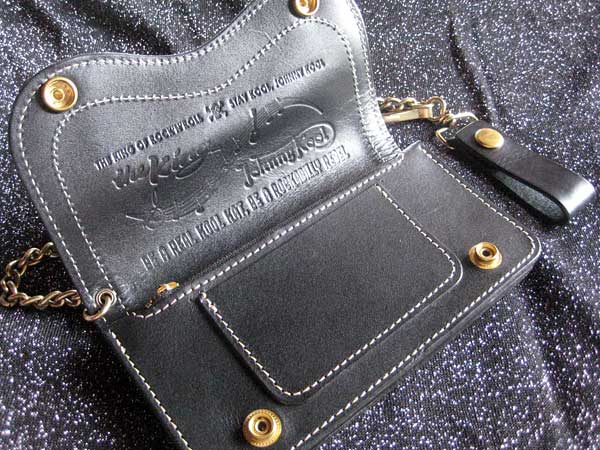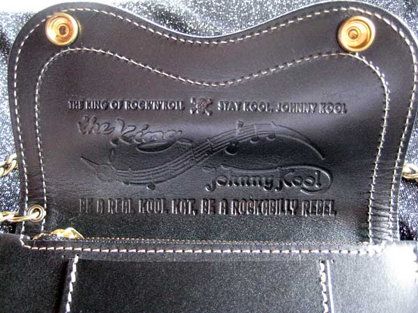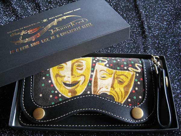 「THE KING」とのコラボレーションにより誕生したツーフェイス・ウォレット。ツーフェイスがプリントされたコーデュロイ素材とブラック・レザーの切り替えがKOOLなフィフティーズ・ムード満点の財布です。金属パーツにはビンテージな雰囲気にマッチするブラス(真鍮)を使用し、ステッチ糸もビンテージ感を表現するためにオフ・ホワイト色で縫い込んであります。また、コラボ作品を証明するギフトボックスのデザインは、ウォレットのフラップ裏にも型押しされており、完全無欠のコラボ仕様となっています。尚、ウォレット本体にはウォレット・チェーン用のハトメが付いているので、チェーン交換も容易です。BACK TO THE FIFTIES!